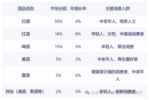 其他酒品:包括清酒、、、果酒等在内的其他酒品市场份额虽小,,,但增长速度较快。。。。这些酒品以其独特的口感和尝鲜性质吸引了一部分年轻消费者。。